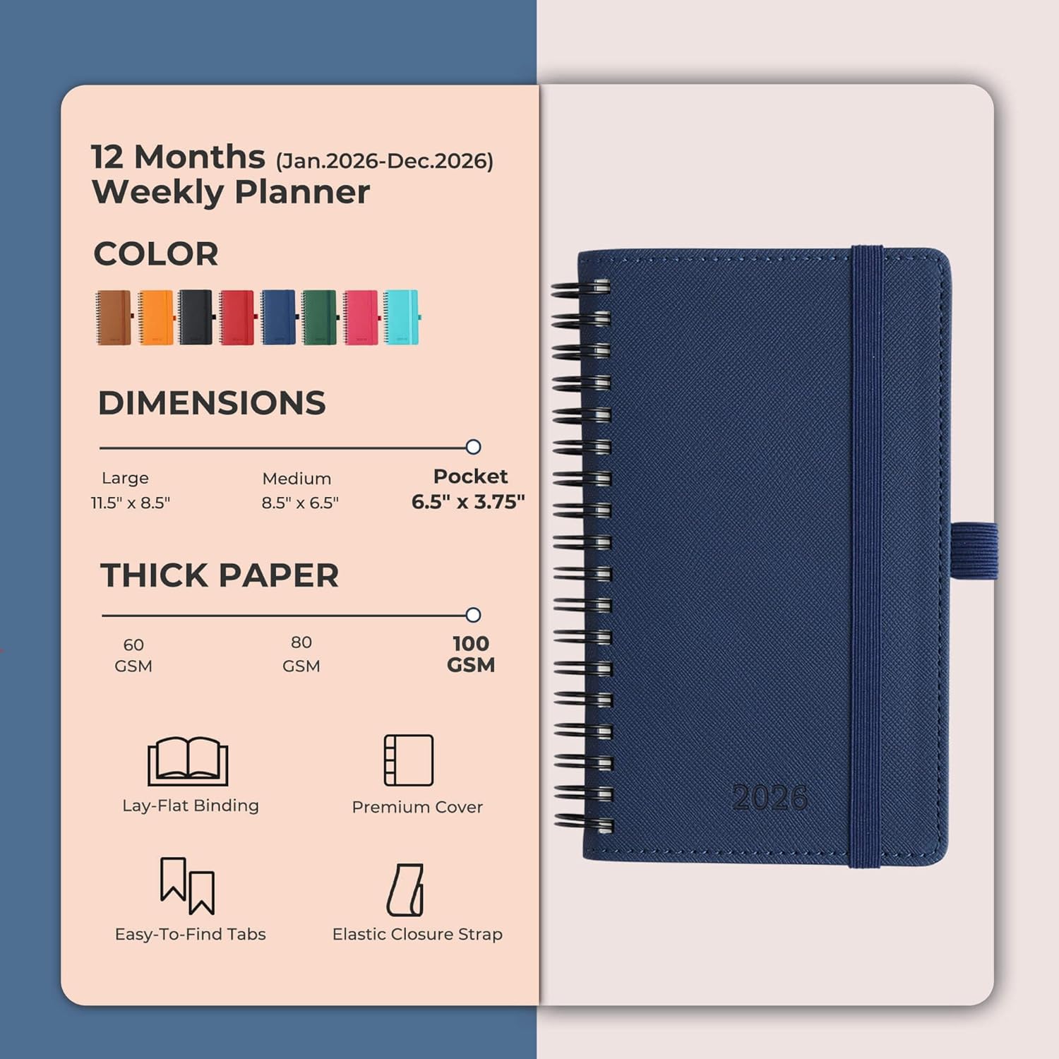 - Great Material for Weekly Planner: Crafted with FSC-100gsm thick paper that resists ink bleed and daily wear, this 2026 planner ensures smooth writing with markers while gentle on your eyes through its ivory white pages. The Vegan leather soft cover and reinforced lay-flat binding make it a calendar planner companion for busy professionals, students, and families