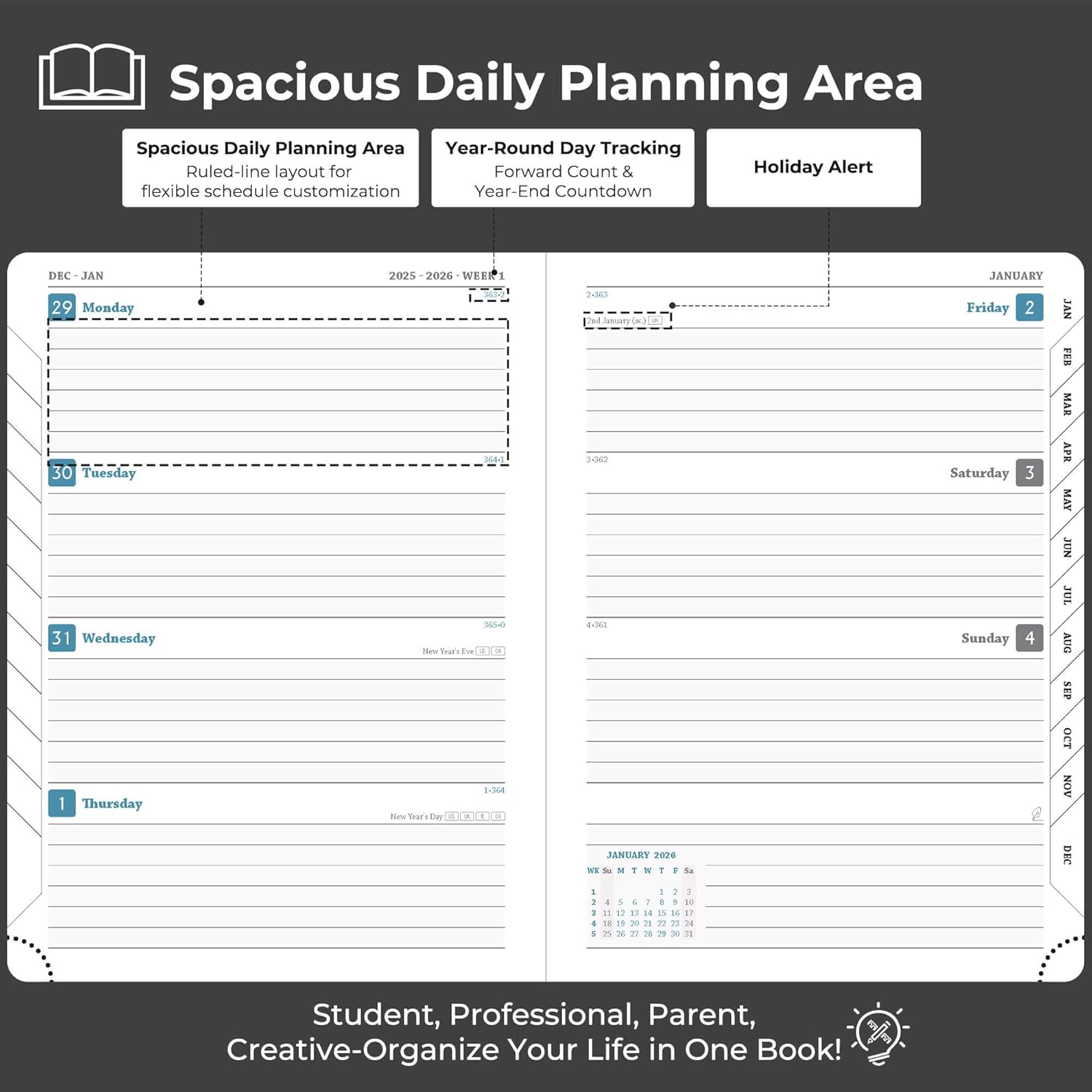 - Compatible 2026 Planner: Adaptable across lifestyles and roles. Professionals track workflows, conference logistics; students plan academic schedules, evaluations, and after-school; households manage vacation arrange & family activity