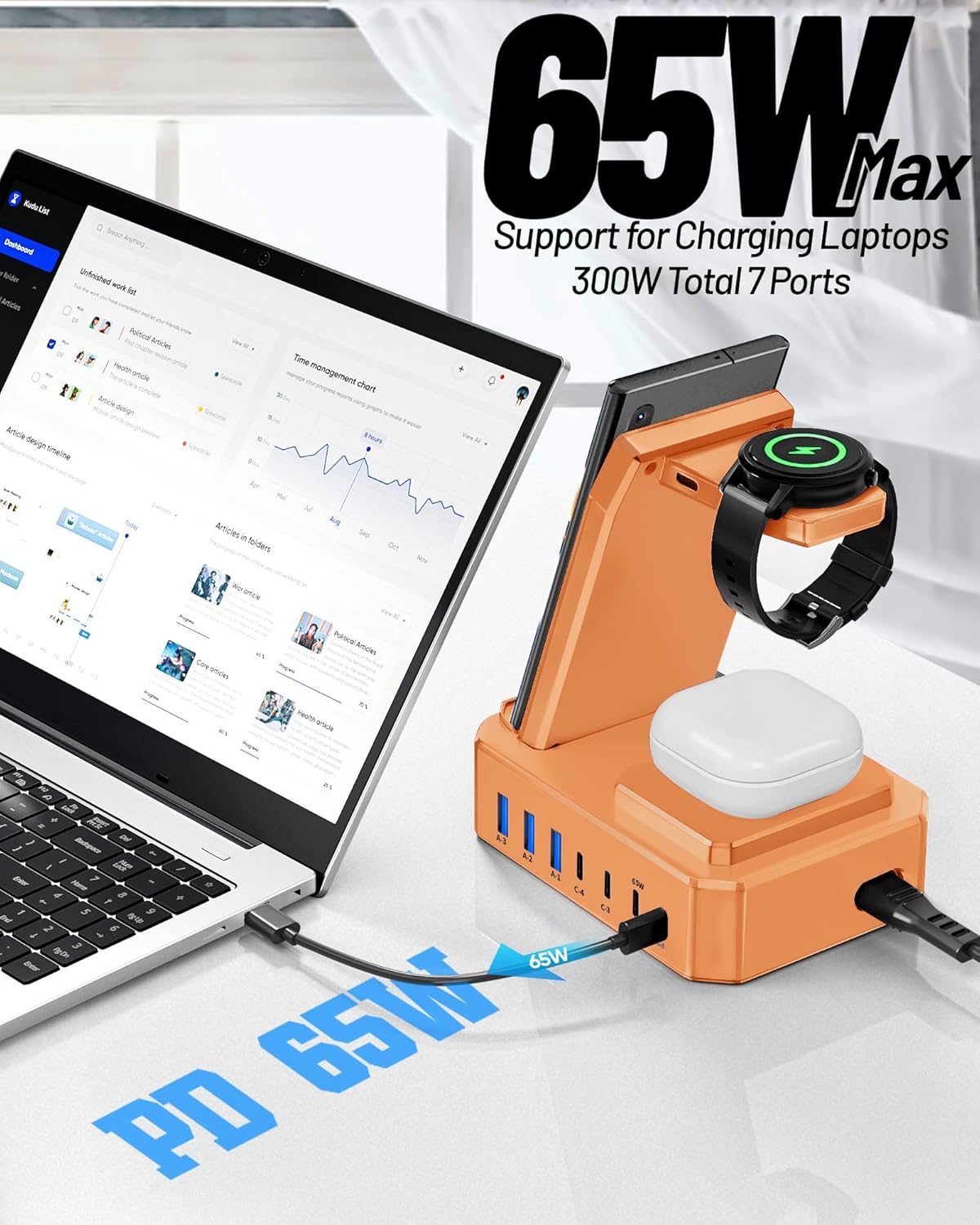 - ă300W Charging Station for Multiple Devicesă: Charges up to 10 devices simultaneously.This desktop phone charging station is the perfect solution for charging multiple devices! Our charger station features 2 powerful 65W USB-C ports designed specifically for charging laptops, 2 efficient 30W USB-C ports and 3 versatile 30W USB-A ports . Samsung wireless charging station total output can be up to 300W. You can conveniently fast charge your samsung devices and other devices at the same time.