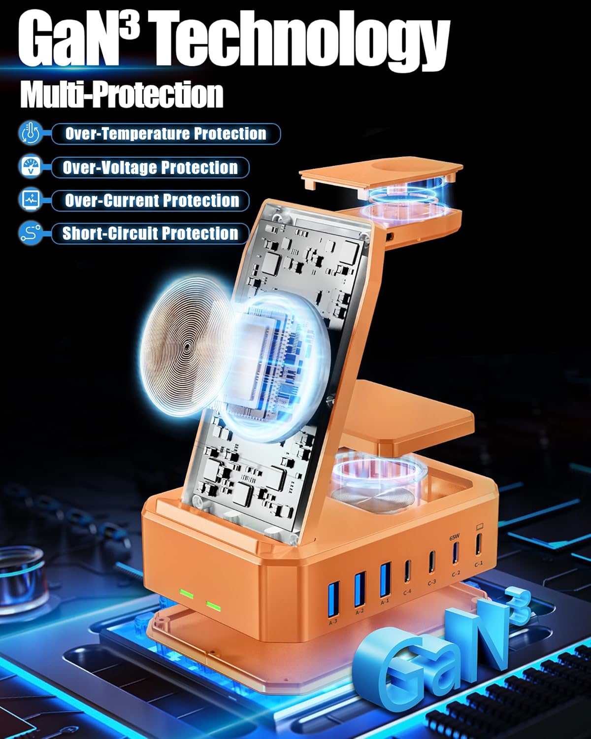 - ăSafe Charging&Multiple Protectionă: Our Dual 65W PD usb c fast charger dock is equipped with the latest intelligent and efficient chipset with GaN III technology to ensure fast and safe powering of your devices. Ready to charge your Macbook series and other laptops. Our phone and watch charging station features over-current, over-voltage, over-temperature and over-charging protection. The internal circuitry is designed to prevent overcharging from damaging your device, ensuring safe charging.