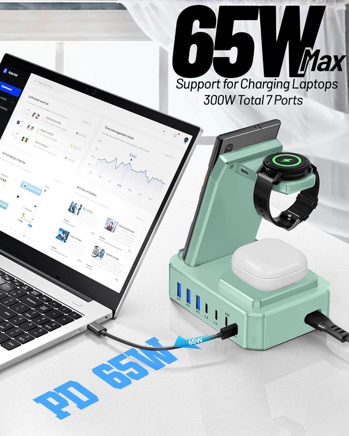 - ă300W Charging Station for Multiple Devicesă: Charges up to 10 devices simultaneously.This desktop phone charging station is the perfect solution for charging multiple devices! Our charger station features 2 powerful 65W USB-C ports designed specifically for charging laptops, 2 efficient 30W USB-C ports and 3 versatile 30W USB-A ports . Samsung wireless charging station total output can be up to 300W. You can conveniently fast charge your samsung devices and other devices at the same time.
