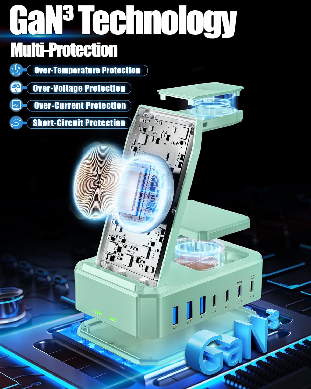 - ăSafe Charging&Multiple Protectionă: Our Dual 65W PD usb c fast charger dock is equipped with the latest intelligent and efficient chipset with GaN III technology to ensure fast and safe powering of your devices. Ready to charge your Macbook series and other laptops. Our phone and watch charging station features over-current, over-voltage, over-temperature and over-charging protection. The internal circuitry is designed to prevent overcharging from damaging your device, ensuring safe charging.