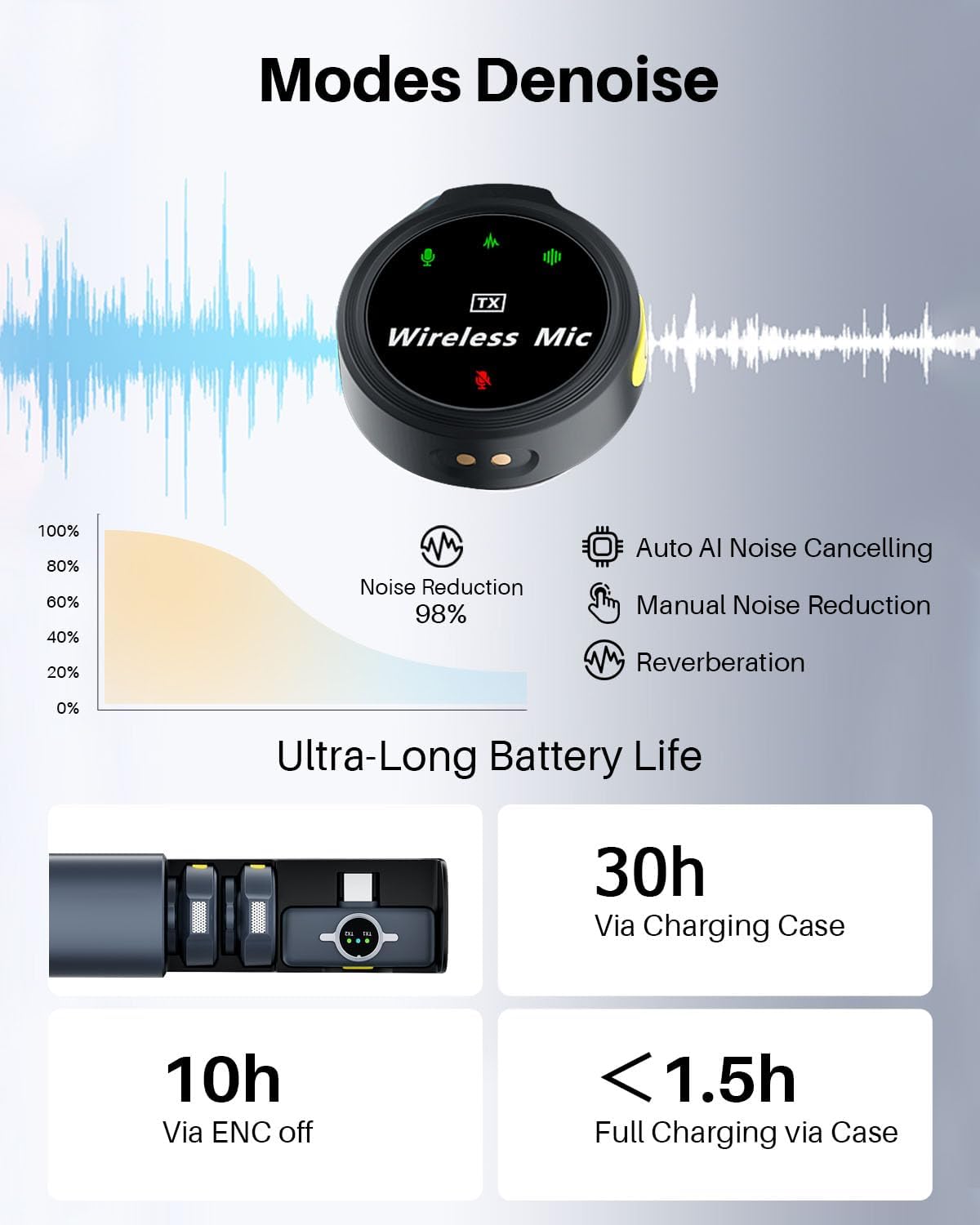 - Design for Professional: The Caiord M6 microphone boasts a 48kHz/24bit audio format for accurate sound capture. With a 70dB signal-to-noise ratio, it delivers excellent audio with minimal background noise. Plus, it can handle up to 115dB Sound Pressure Level, perfect for recording high-pitched sounds. Visual dials have been designed to provide clear insight into the microphone's usage status, including connection, noise reduction function, mute, battery usage, and more.