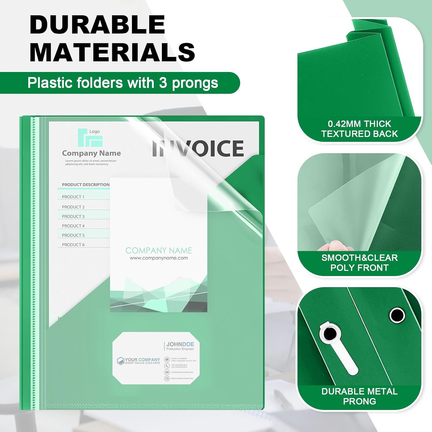 Teling 48 Pcs Clear Front Report Covers with 3 Prongs Fasteners, 11.42 x 9.45 Inch Plastic Book File Covers 90 Sheet Capacity, Presentation Folder with Green Back Cover for Office Business