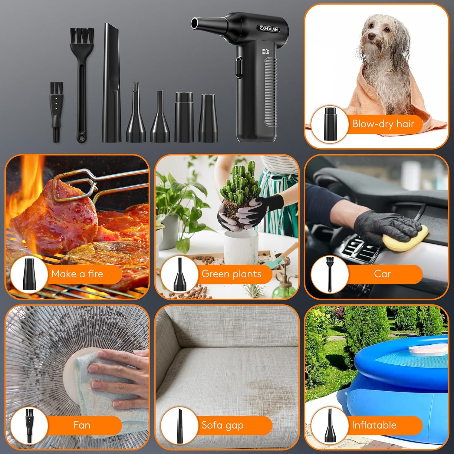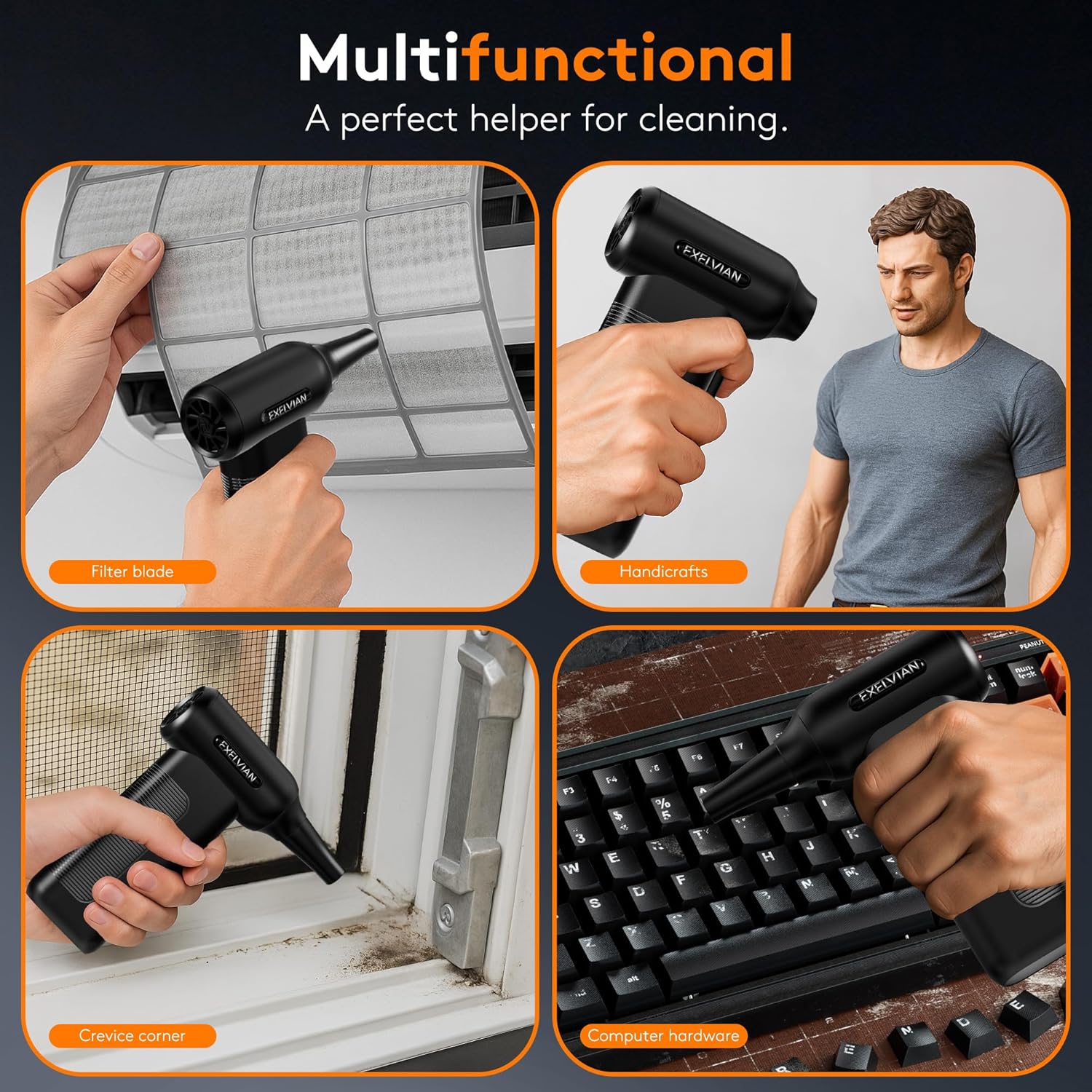 - 【Multi-Functional】Suitable for various scenarios. It can also be used for cleaning window grilles, igniting campfires, inflating swimming rings and air beds, air conditioners, etc. Convenient for cleaning in dimly lit corners.