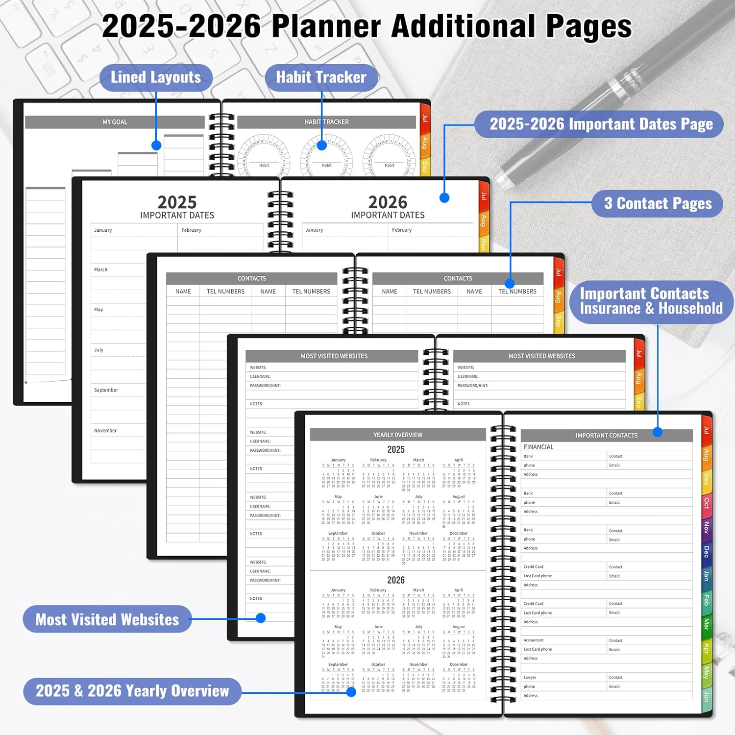 - ăMore Pages Stay OrganizedăAgenda Book Planner 2025-2026 printed on 120GSM paper to reduce ink passage, extra contains quick reference information, annual overview, important contacts, password page, 2025 & 2026 & 2027 major holidays, 15 note pages throughout the year to suit your schedule needs.