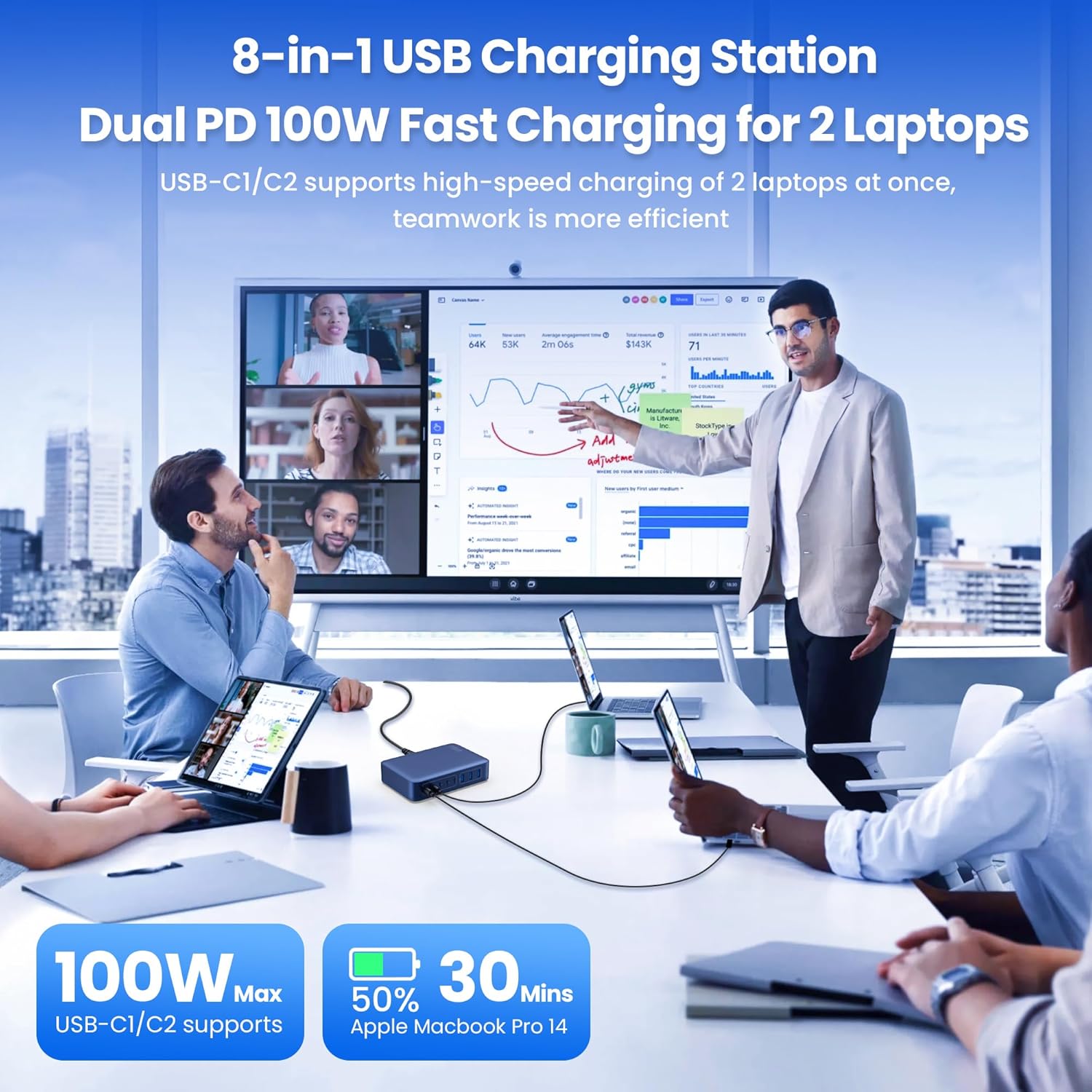 - ăUpgraded Dual PD 100W for MaceBook ChargerăThe USB-C1&C2 ports support advanced PD 100W fast charger ports,it Charges a MacBook Pro 16'' M1 / M2 from 0% to 55% in about 30 minutes and a full charge in just 1.6 hours, and an iPhone 16 from 0% to 65% in about 30 minutes. we's USB-C charger block can super-fast charge 2 laptop, 1 phones/tablets and 5 others at once,from large to small, the usb-c power adapter compatible with 1000+ devices include MacBook Pro/Air, Microsoft Surface, Dell XPS, Samsung Galaxy, iPad Pro, Steam Deck, iPhone, Google Pixel, covering a whole family needs and save money&space.