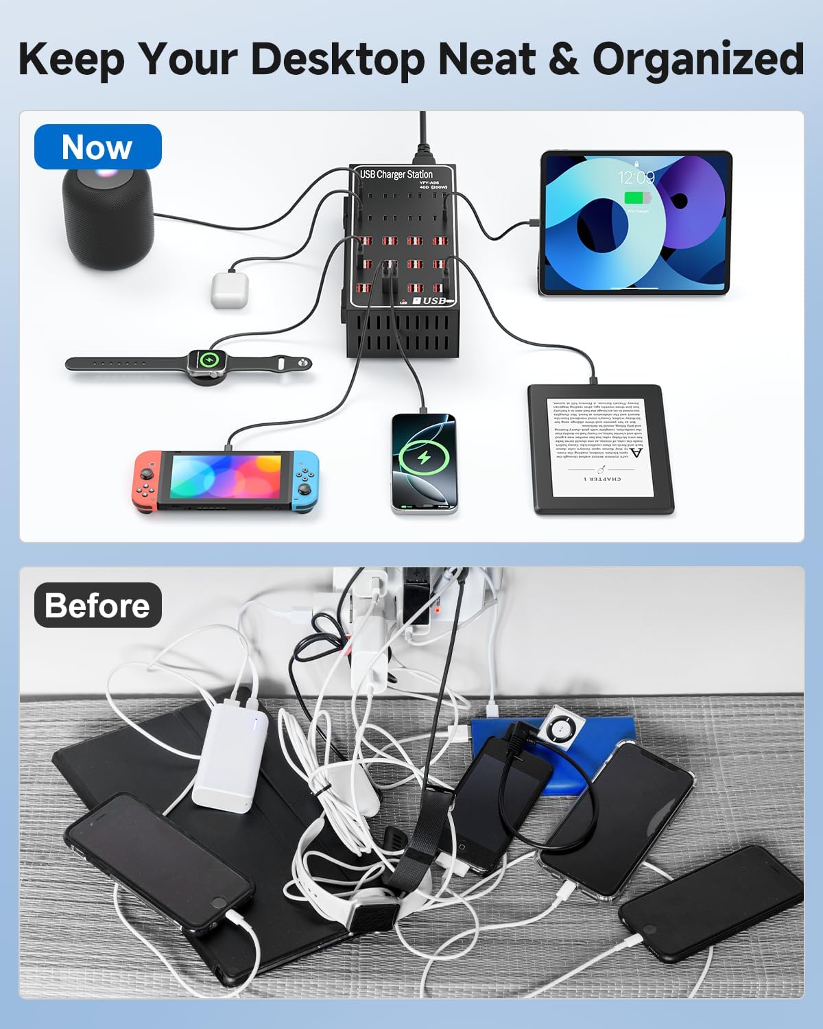 - Fast Charging & Wide Compatibility: Each of the 40 ports has an independent smart chip to automatically deliver the safest and fastest charge. Compared to other low-power USB charging stations, this multi usb charging hub offers up to 3x faster charging speeds.Compatible with iPhone, iPad, Samsung Galaxy, Kindle, AirPods, smartwatches, USB~C devices, and more.