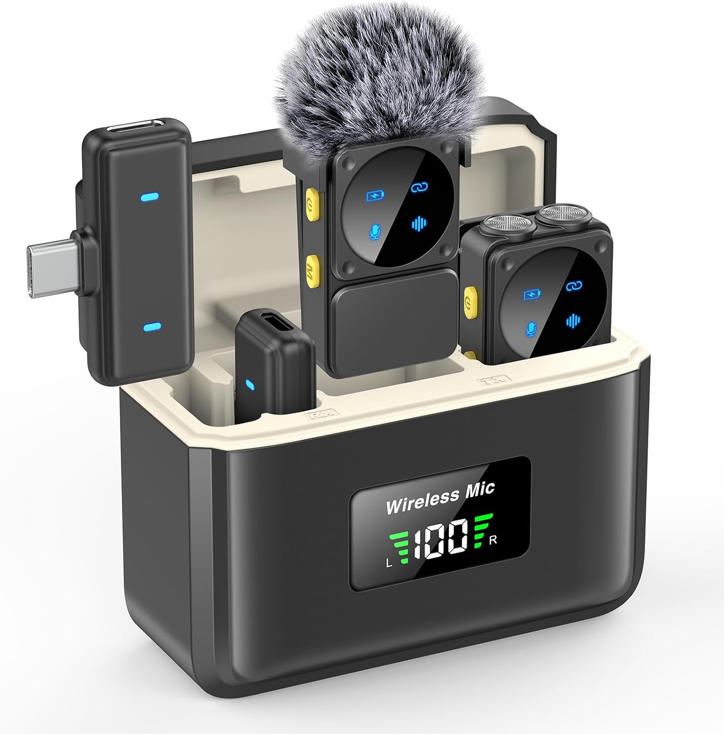 - [80H Working Time and Rechargeable] The compact charging case provides an additional 80 hours of backup power. A single microphone can work 10 hours when fully charged (1.5 hour). It means you can use two microphones for up to 20 hours. You also can use the wireless microphone for iphone when charging your device—no need to worry about battery life.
