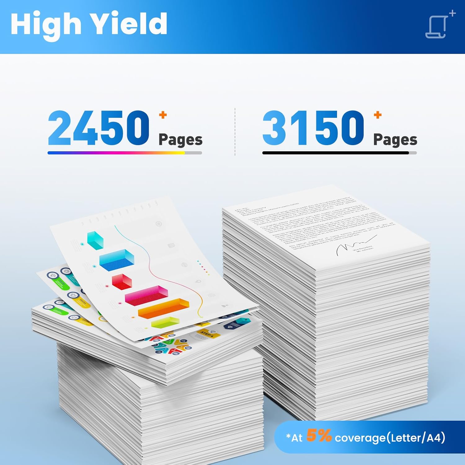 - 206X Toner Cartridges High Page Yield: High yield up to 3150 pages for 206X black toner cartridge and 2450 pages for 206x Cyan/Magenta/Yellow toner cartridge 5% coverage Letter/A4. Print documents or charts clearly and suitable for standard office/home printing.