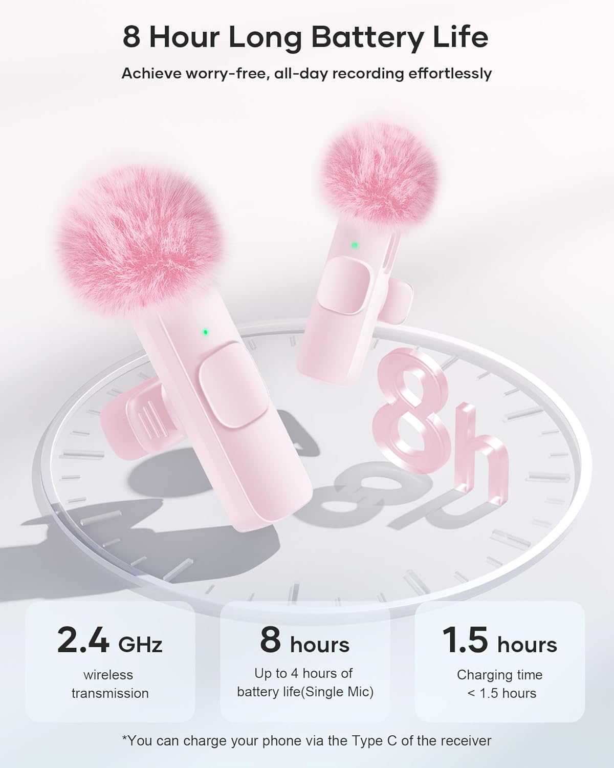 - Rechargeable Transmitter and Receiver: The wireless lapel microphone comes with a built-in rechargeable battery, requiring only 1.5 hours of charging time and providing up to 4 hours of working time. The Receiver can also charge your phone while in use, eliminating worries about insufficient battery power.