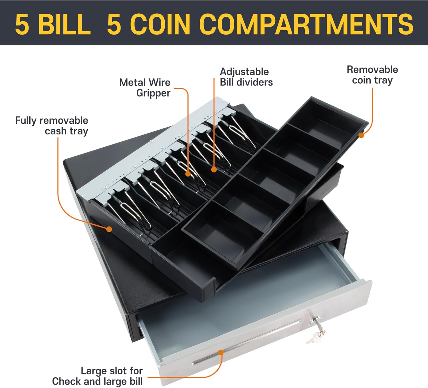 - 📦Stainless Steel Front & Movable Till: This cash drawer not only ensures security but also adds a touch of durability with its Stainless Steel Front. Customize your cash organization with the movable till, providing flexibility to adapt to your business needs.