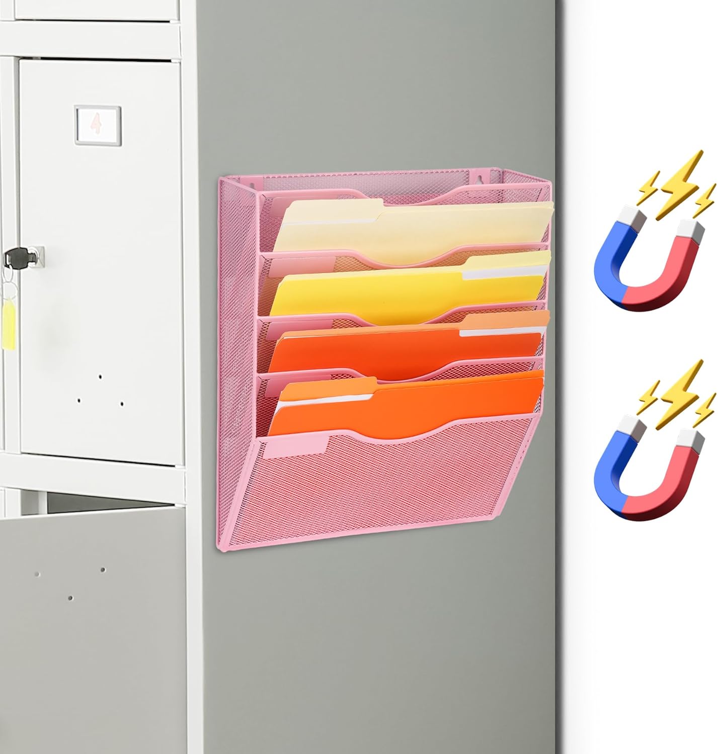 EASEPRES Magnetic 5 Pocket Mesh Hanging File Organizer, Wall Mounted Mail Paper Document Folder Holder, Clipboard Storage Organization Magazine Rack with Nametag Label for Office Home School, Pink