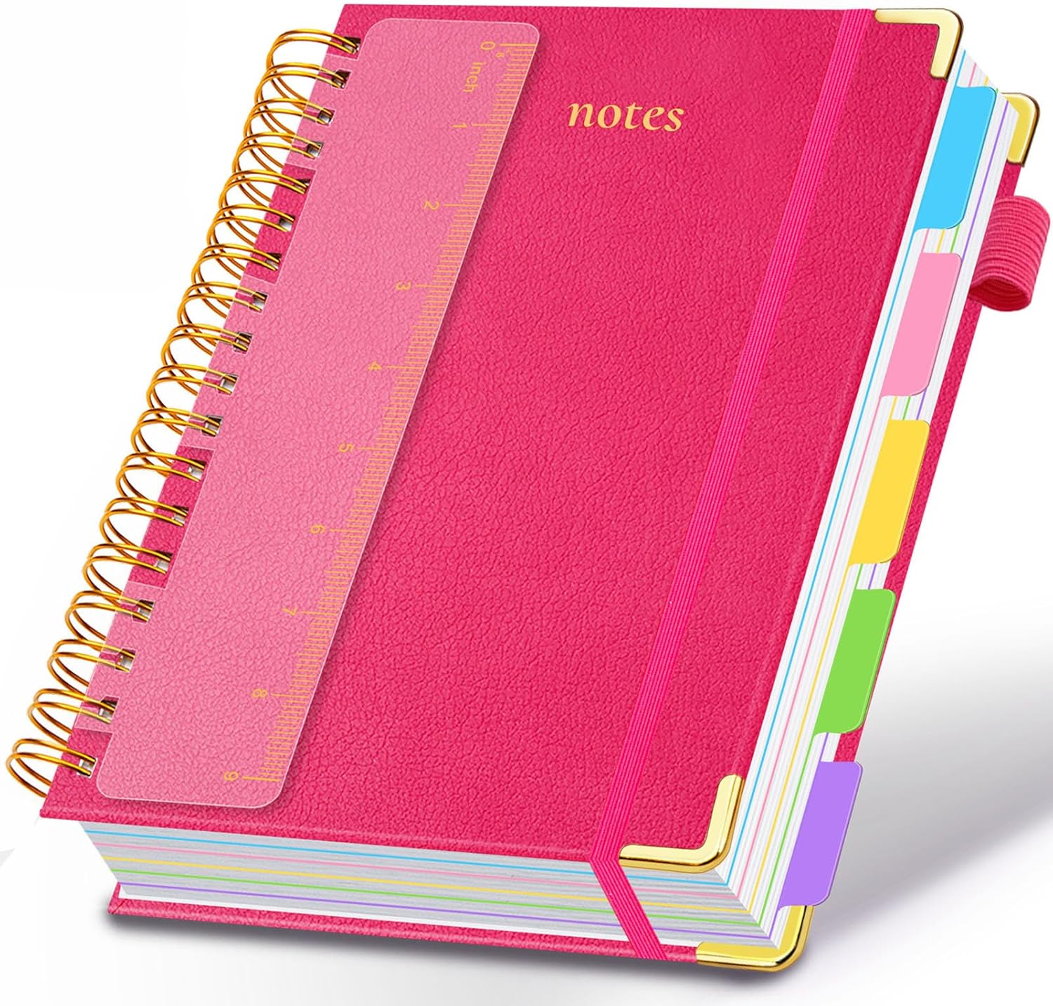 Hardcover Spiral Notebook 8"x10" Journal Notebook with Tabs and Removable Dividers 300 Pages 5 Subject Notebook College Ruled, Faux Leather Spiral Bound Notebook for Women, Students, School Work (Rose Red)