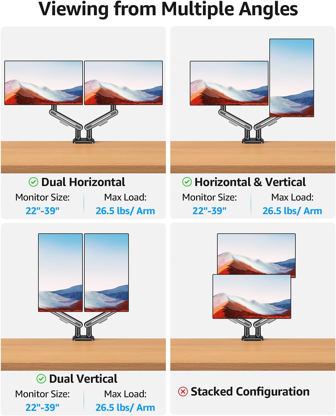 - Supports Serious Screens - The monitor arm handles monitors up to 26.5 lbs and fits screen sizes from 22" to 39", with VESA 75x75mm and 100x100mm compatibility. Whether it’s an ultra-wide for spreadsheets or a 4K display for gaming, this dual monitor mount lifts with ease and stays rock-solid.