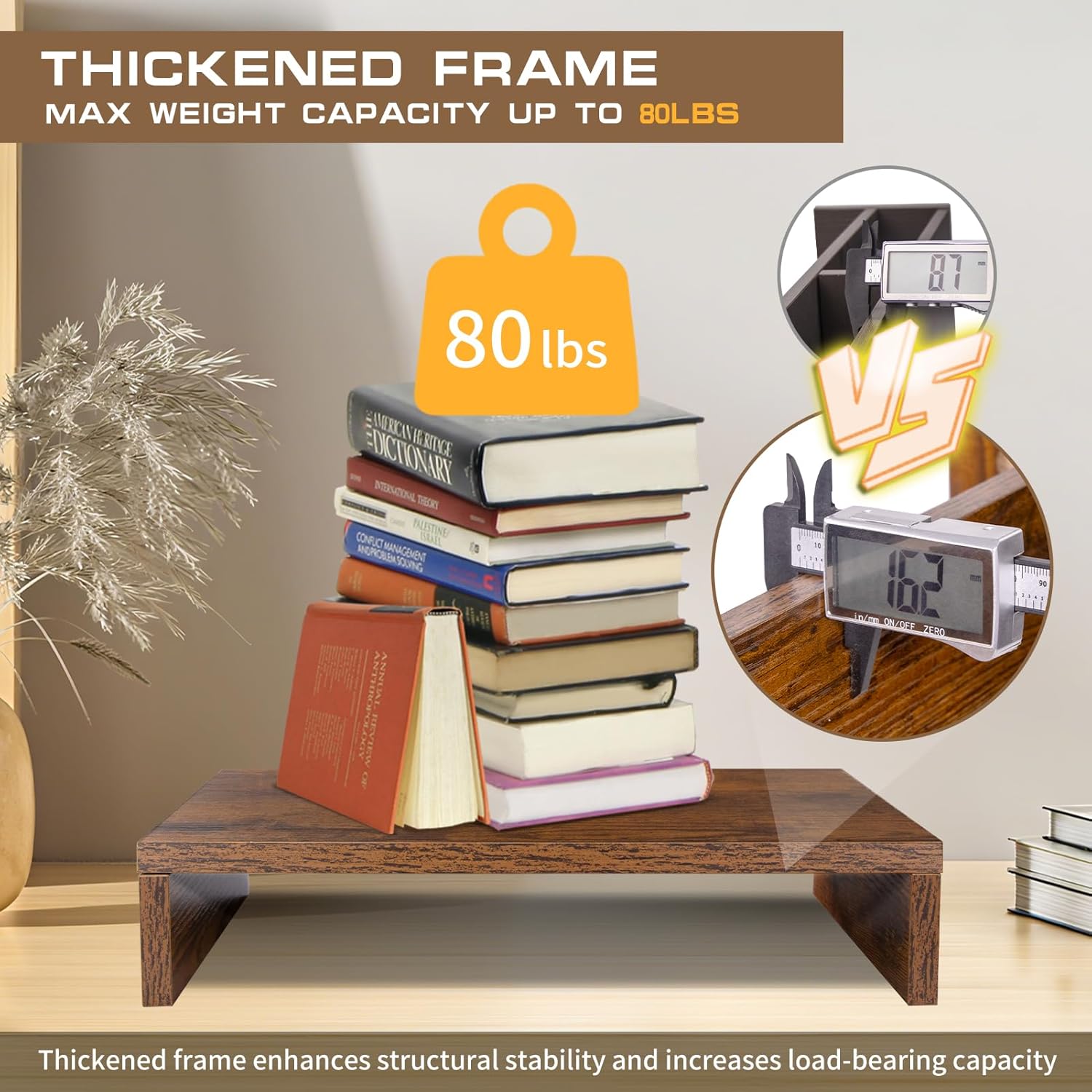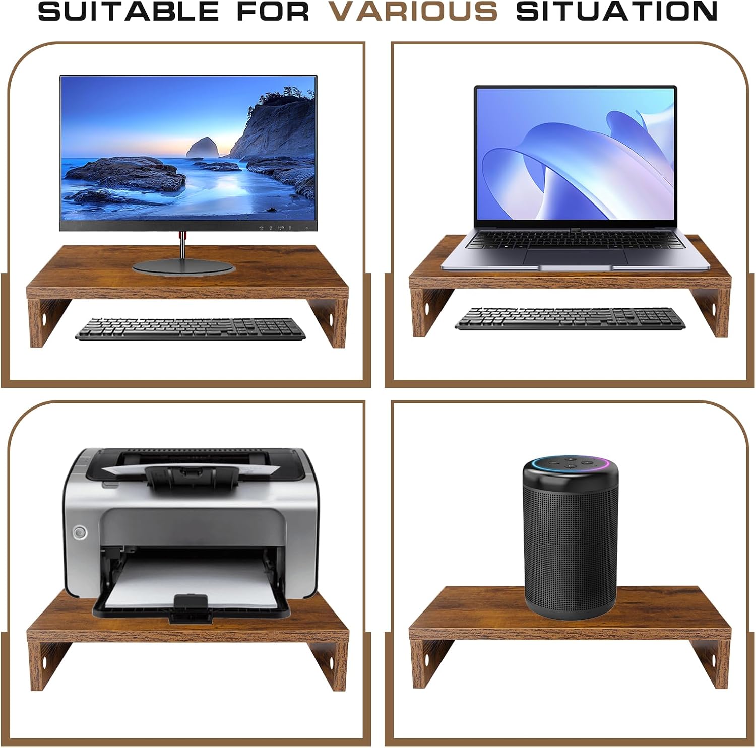 - Sturdy and Reliable Construction:Engineered to support up to 80 lbs, this stand riser provides exceptional stability for your office essentials. The reinforced frame and premium materials ensure long-lasting durability. The wooden monitor riser features soft rubber feet that provide complete stability for your display while protecting your desktop from scratches.