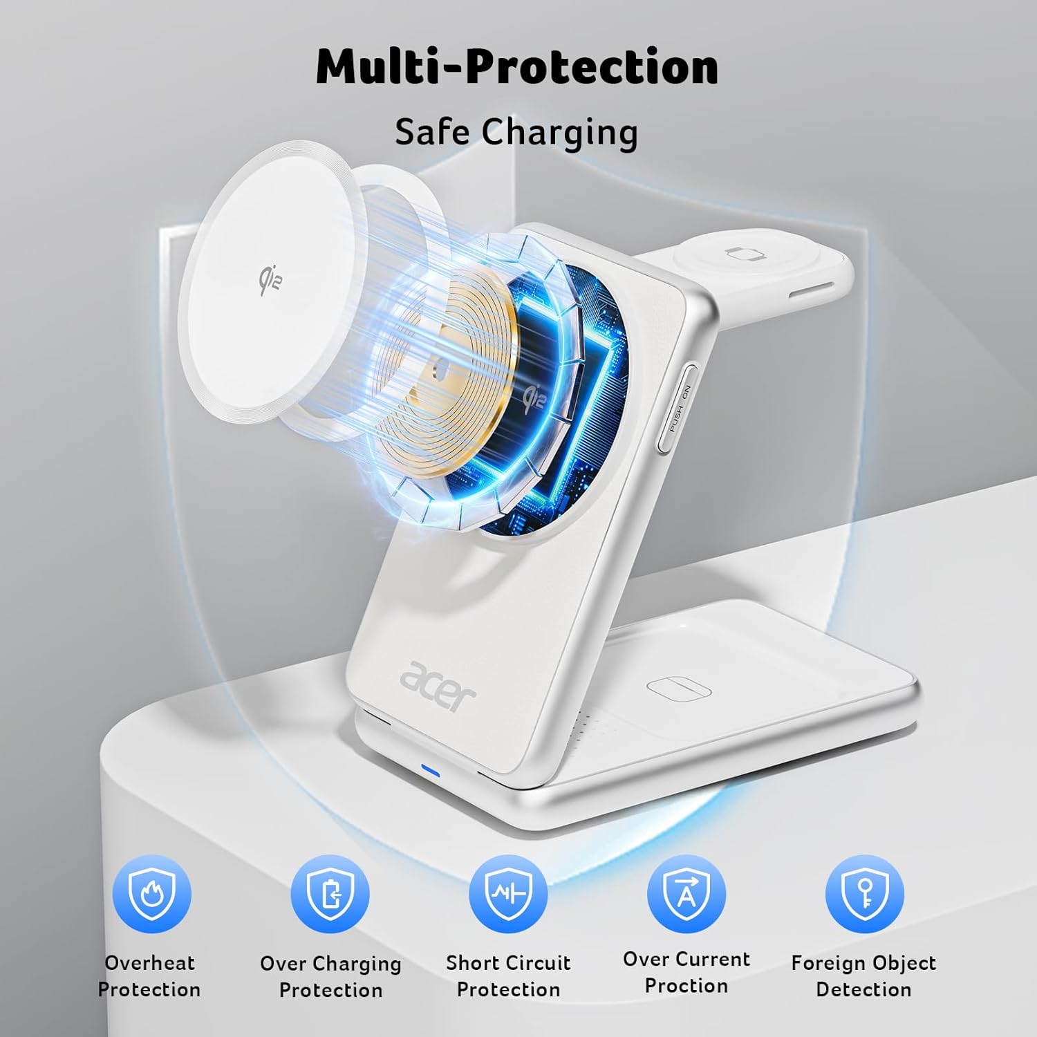 - [3 in 1 Wireless Charger Station]: The Acer 3-in-1 Magnetic Wireless Charging Station offers seamless compatibility with a wide range of devices, including for iPhone 16/15/14/13/12 series, for Samsung Galaxy Buds, for Apple Watch Series 10 through 2 (including SE and Ultra models), and for AirPods Pro 2/3/4 as well as AirPods 2/3/4 (Note: MagSafe-compatible charging case required for non-Pro AirPods). It’s a good Christmas present for couples and family.