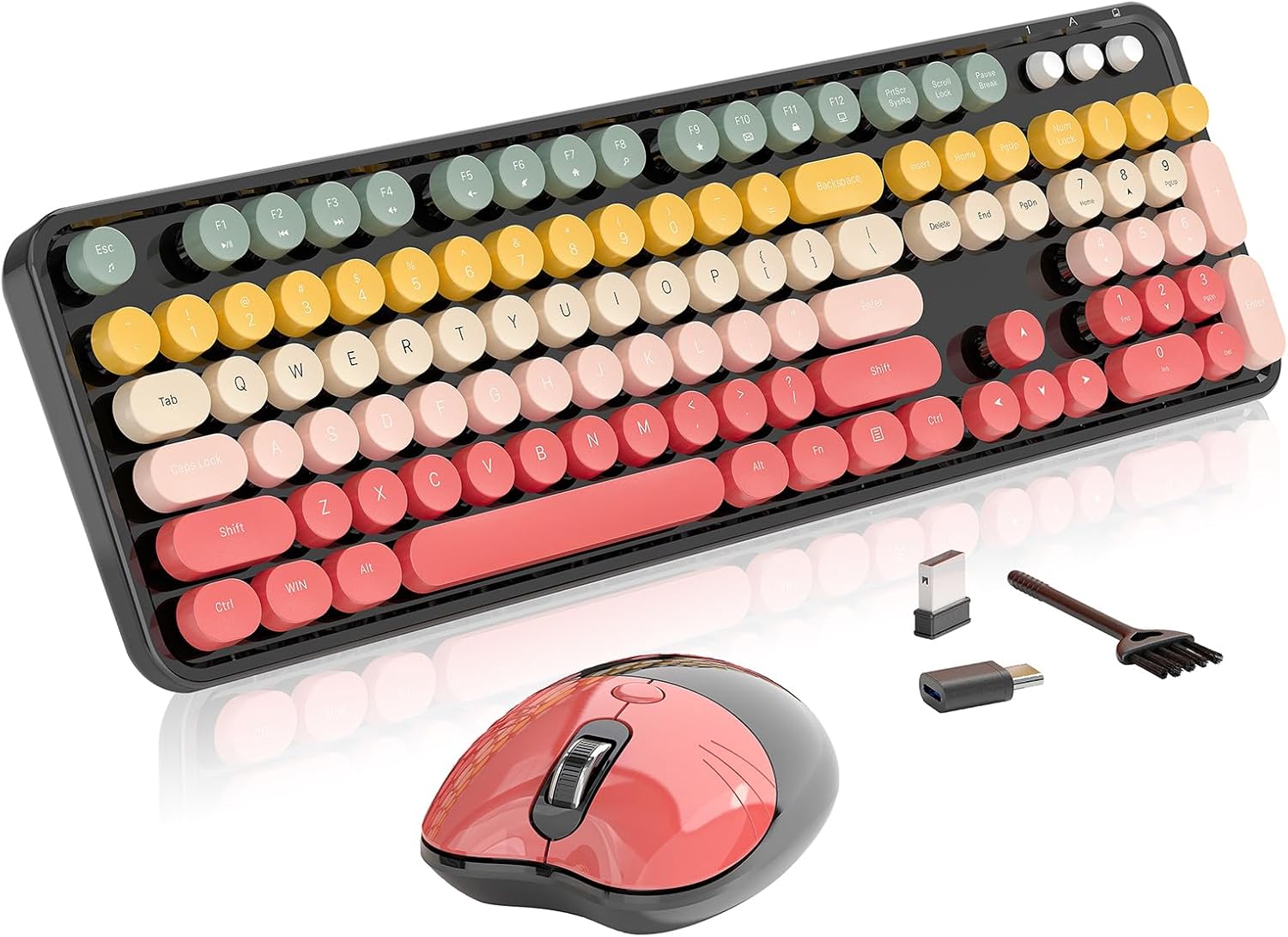 Wireless Keyboard and Mouse, MOFII 104 Round Keycaps Retro Typewriter with OTG & Brush, Full-Size Ergonomic, Ideal for Windows PC, Home, Office and College Rainbow Red