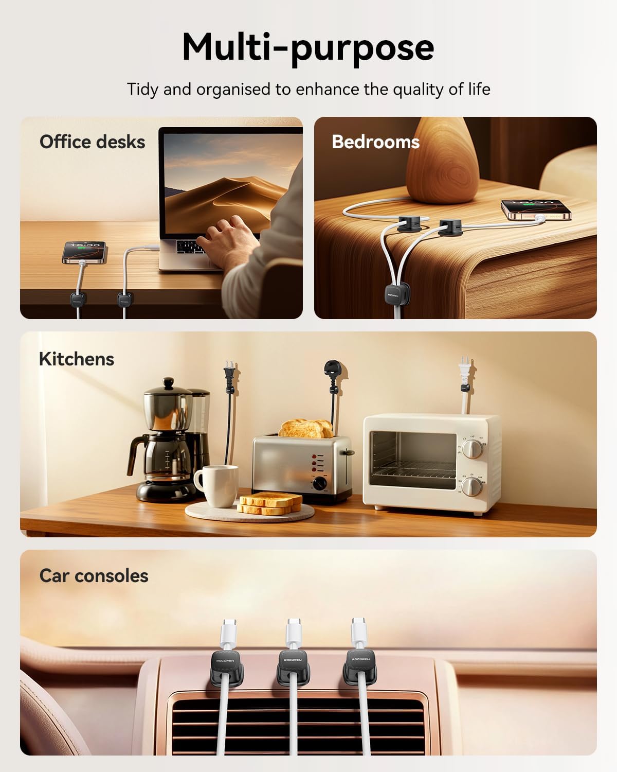 - High-Strength ABS Material:Rocoren magnetic cable management Passed 2000 gravity cycle tests (Lab-Tested Durability), the durability of the rubber material is 200% improved, and it is impact-resistant and corrosion-resistant. Installation tips: Please use alcohol cotton to clean the surface before use, press for 30 seconds to activate the glue, and let it stand for 12-24 hours to achieve the best viscosity (Maximum Adhesion).