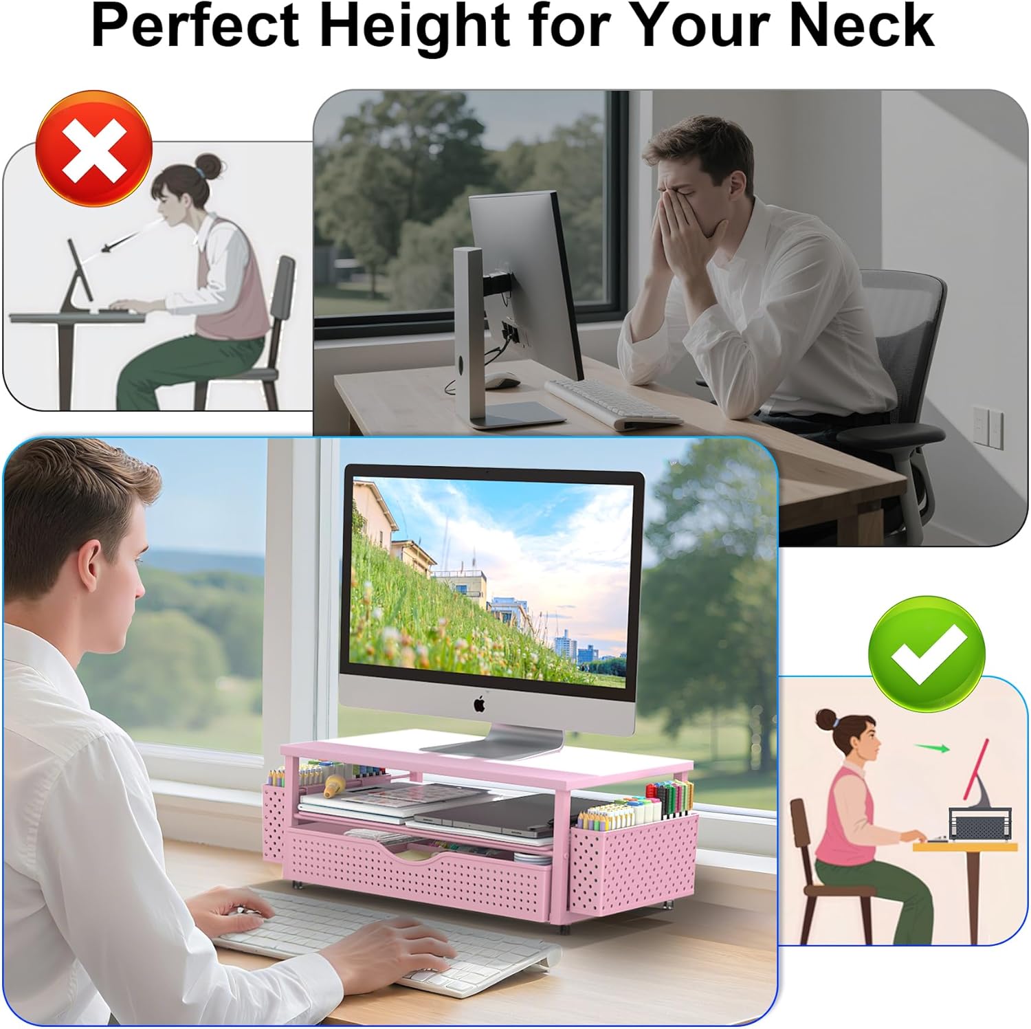 - Ergonomic design: Raise the monitor to eye level for the most comfortable viewing experience, relieve your neck, back, waist, help you develop a good posture and provide a neat workspace.experience.