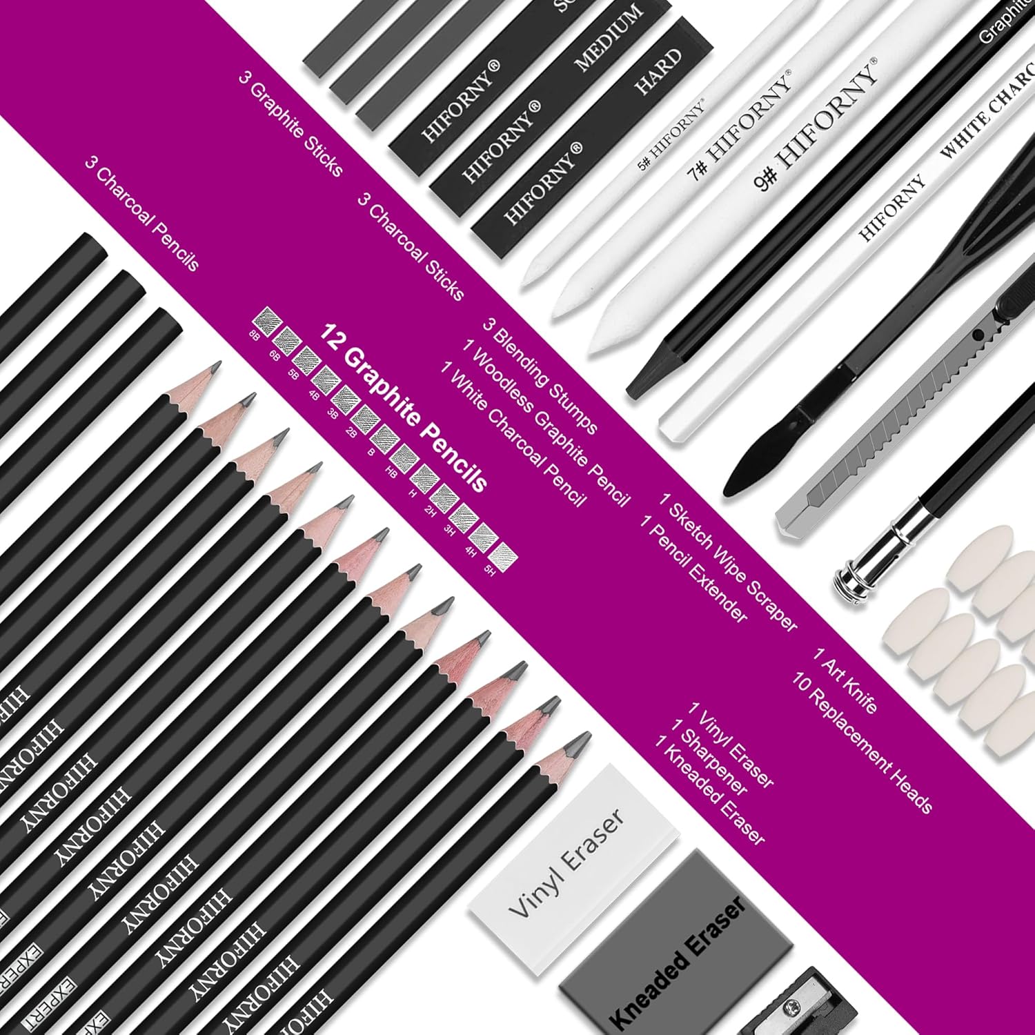 - Complete Drawing Pencil Set: HIFORNY 42 PCS sketching and drawing kit includes 12 premium graphite pencils (8B, 6B, 5B, 4B, 3B, 2B, B, HB, 2H, 3H, 4H, 5H), 3 black charcoal pencils (Soft, Medium, Hard), 1 white charcoal pencil (Medium), 1 woodless graphite pencil (6B), plus 3 graphite and 3 charcoal sticks (Soft, Medium, Hard). Each pencil is clearly labeled for easy selection—perfect for sketching, shading, blending, and layering.