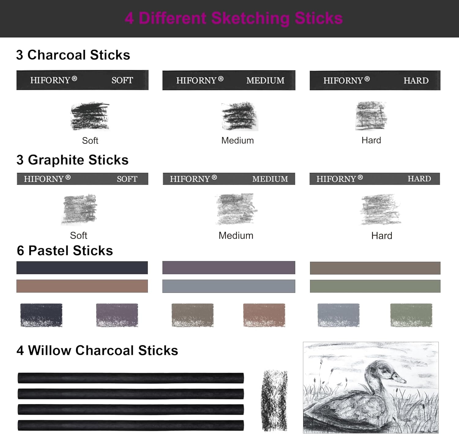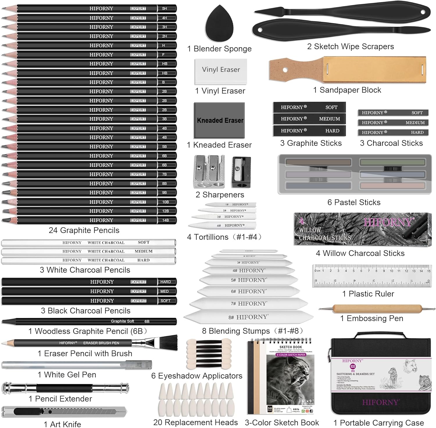 - Complete Drawing Pencil Set: HIFORNY 100 PCS sketching and drawing kit includes 24 premium graphite pencils(14B,12B,10B, 9B, 8B, 7B, 6B×2, 5B, 4B×2, 3B, 2B×3, B, HB×2, F, H, 2H, 3H, 4H, 5H), 3 black charcoal pencils, 3 white charcoal pencils, 1 woodless graphite pencil (6B), 1 eraser pencil with brush, 4 willow charcoal sticks, 6 pastel sticks, 3 graphite and 3 charcoal sticks. Each pencil is clearly labeled for easy selection—perfect for sketching, shading, blending, and layering.