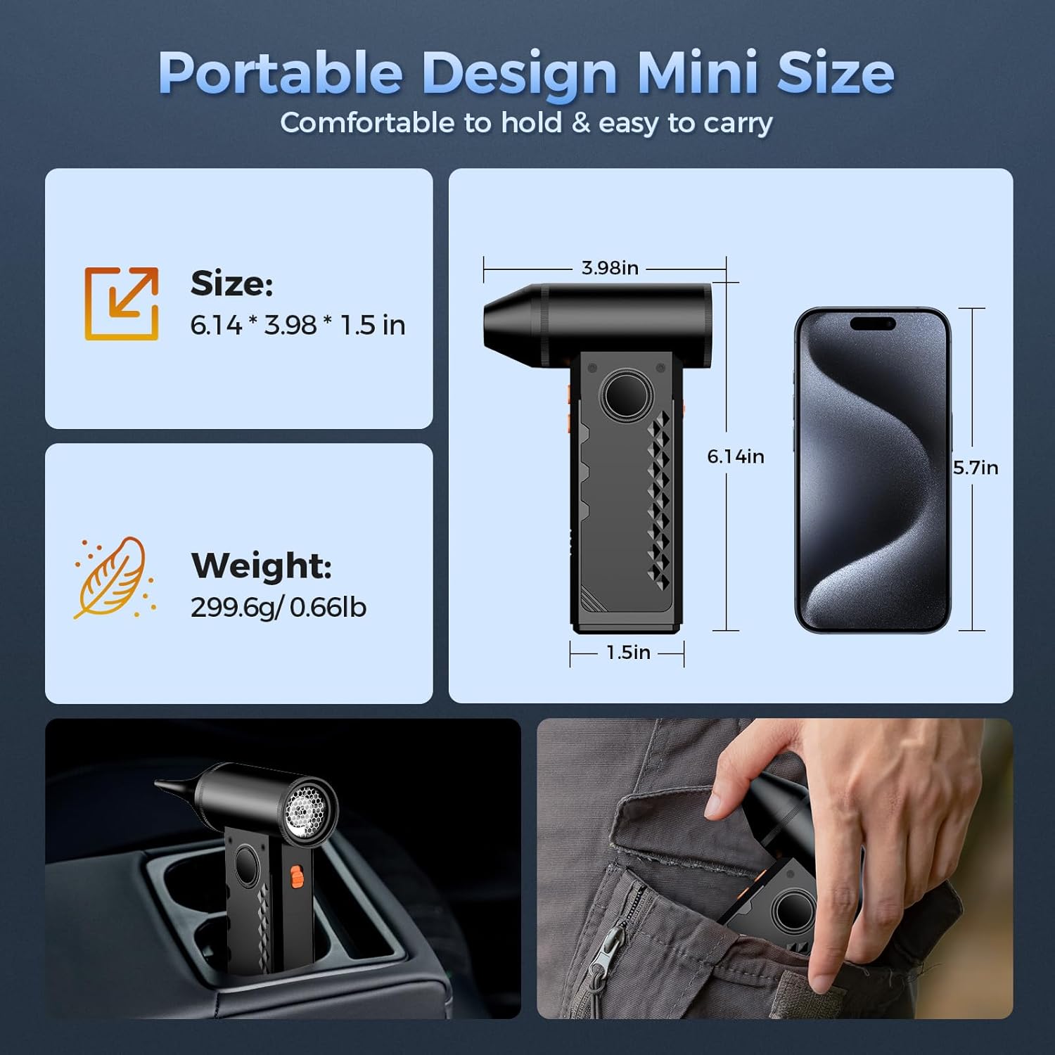 - Compact and Portable Design: compact in size and weighing only 0.66 lbs, this mini air blower is a great go-to companion for a more enjoyable life. It is easy to carry and comfortable to hold. You can store it in a toolbox, bag, car cup holder or pocket without taking up much space and use it anywhere when needed, making it a perfect choice for indoor cleaning, outdoor adventures, travel, and camping.