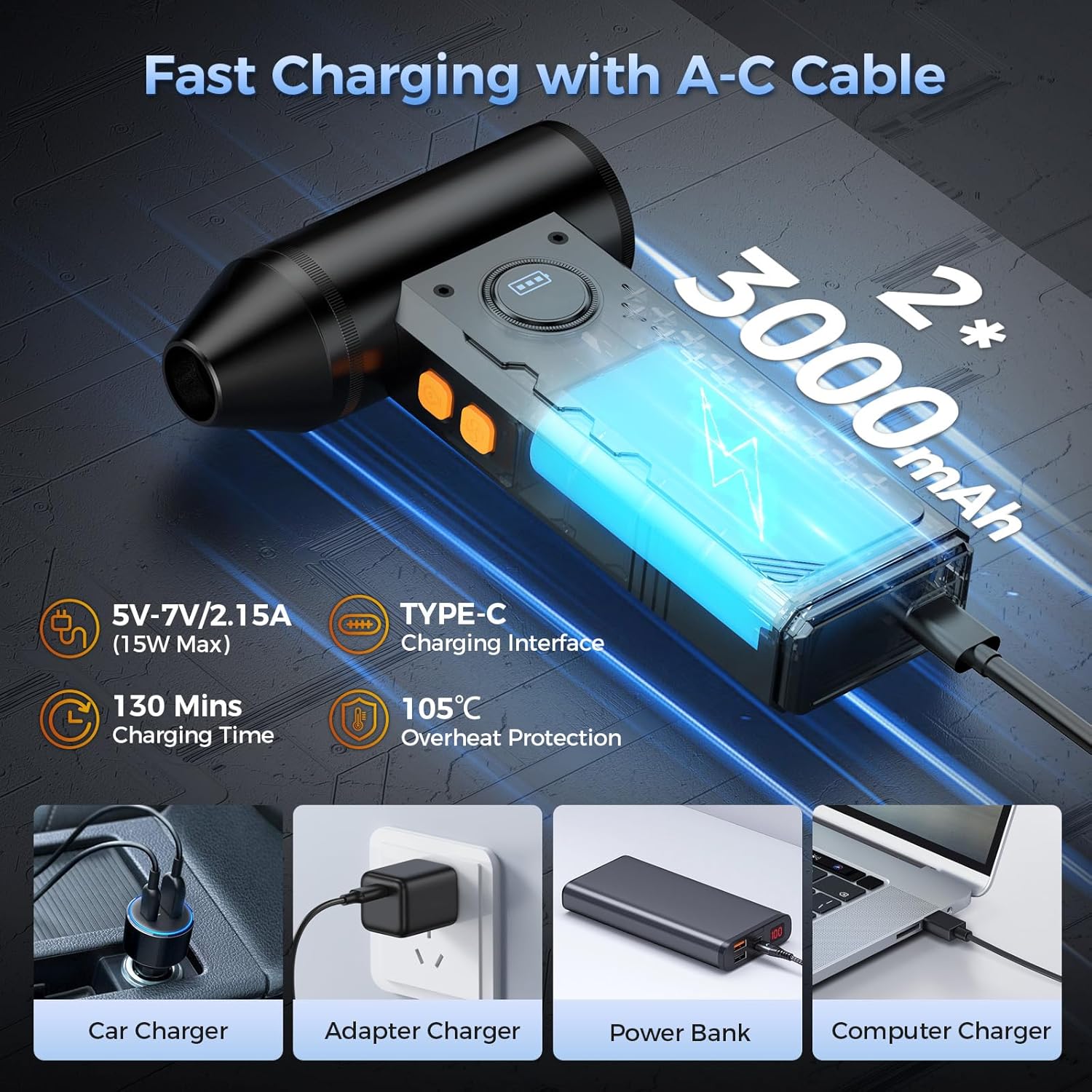 - Fast Charing & Long Lasting: comes with two 3000mAh high-capacity battery and a Type-C cable that supports 15W fast charging, the air can duster can be fully charged in 130 minutes, and the maximum use time can reach 120 minutes(in the first gear), making it hassle-free to get the job done in one go. To ensure the best performance of the electric air blower, please fully charge the battery before use.