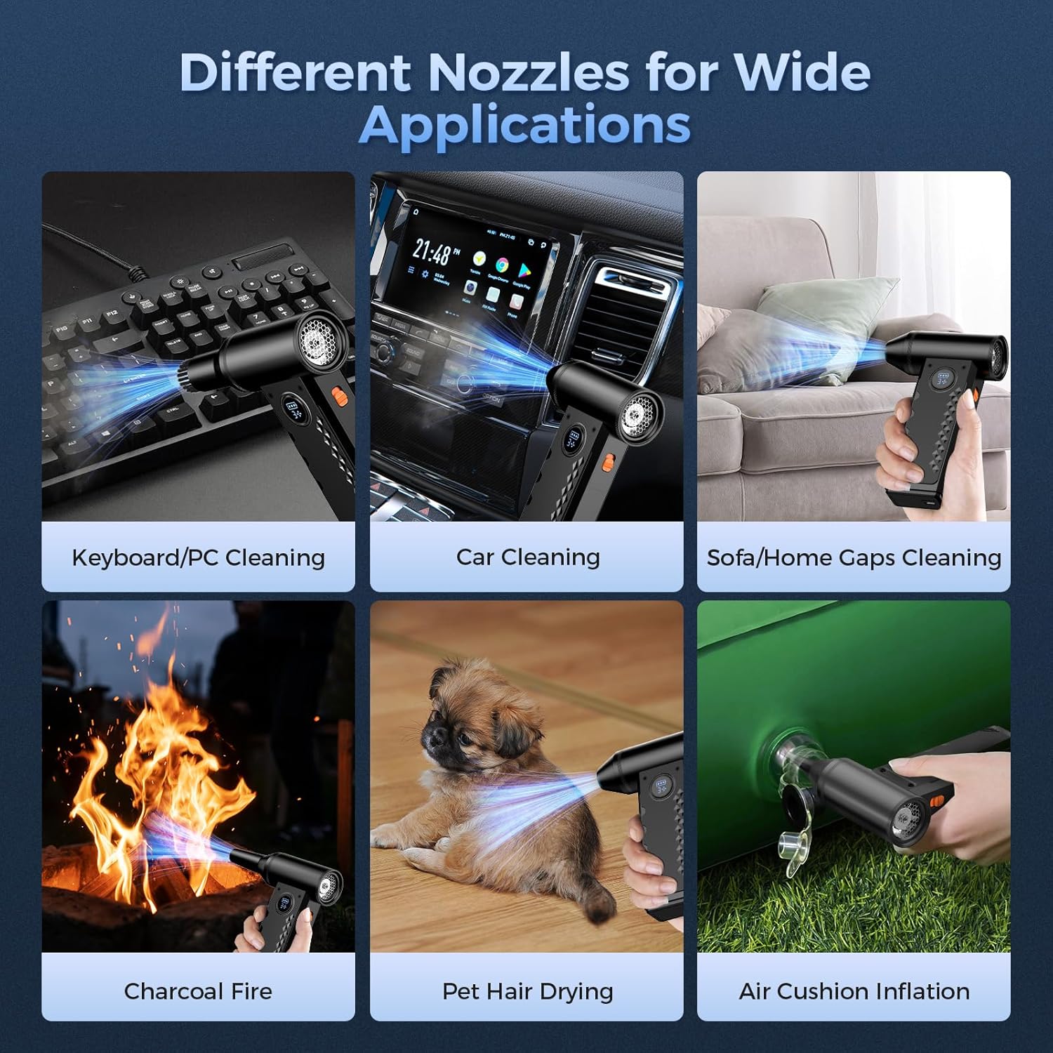 - Multi-purpose Cleaning Tool: featuring 4 nozzles and 4 brushes, the dust blower can meet all your cleaning and outdoor needs, it is suitable for cleaning computers, keyboards, cameras, home appliances, car interiors, etc. You can also use it as a jet blower for picnic fires, blowing snow/ leaves, inflating and drying pet hair. With the ultra-bright LED light, you can see and clean every corner simultaneously, even in complete darkness.