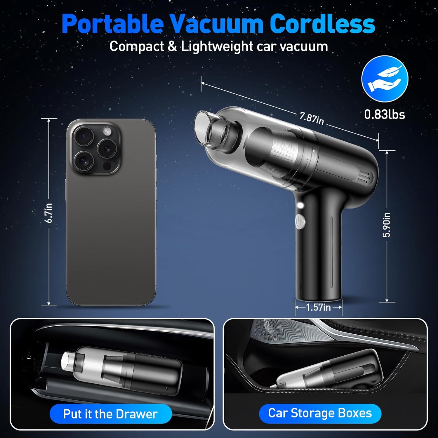 - 【Lightweight and Portable】Small vacuum is lightweight and compact, weighs only 0.83 lbs. Our portable vacuum cordless is easy to store and carry around. Whether you're at home or on the go, it's always ready to tackle cleaning task. The car vacuum cleaner has a cordless design for more free use scenarios and no cord tangles, comes with a portable bag to store the mini vacuum and all the accessories anywhere in your home drawer, office desktop, or car organizer.