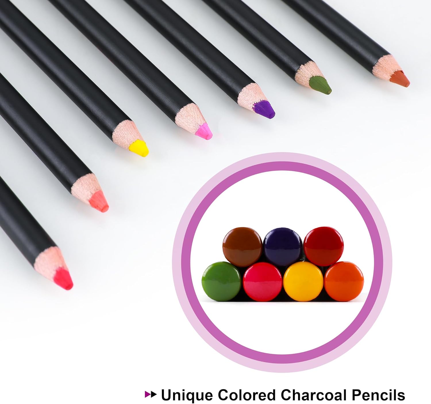 - Unique Colored Charcoal Pencils:Includes 7 high-quality colored charcoal pencils that combine vibrant pigments with charcoal particles. They deliver a smooth, matte finish with deep tones and natural color expression. Perfect for blending, layering, and creating softly textured, low-saturation artworks with rich depth and dimension.