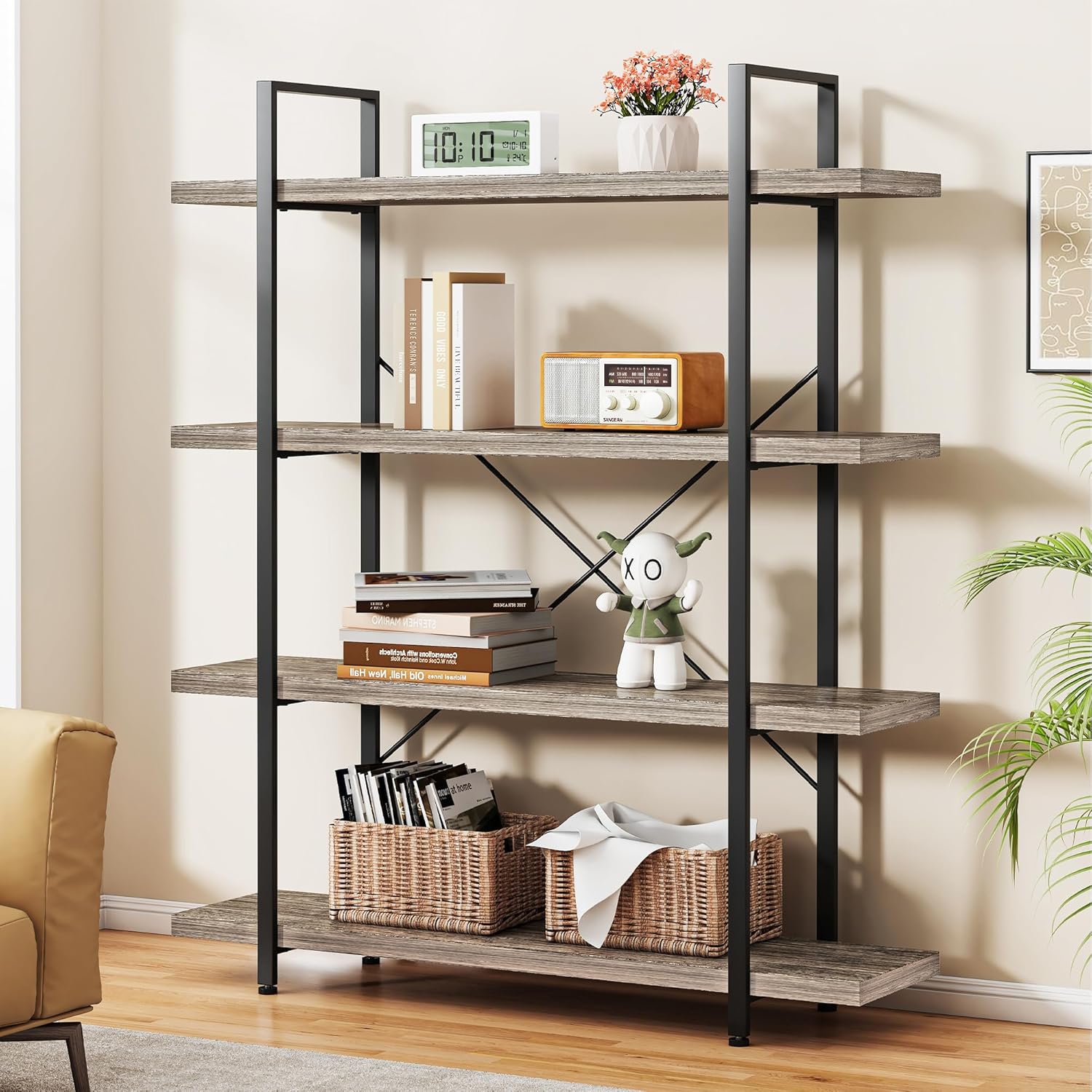 - Industrial Bookshelf Set: OtterOasis four-tier industrial bookshelf is crafted with high-quality metal and brown wood shelves. It seamlessly fits into various decor styles, from modern to rustic, making it perfect for living rooms, bedrooms, offices, and kitchens