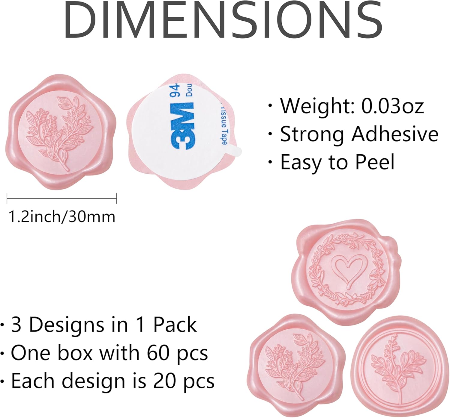 - ăPackage Includedă: 60 beautifully designed wax seal stickers (3 designs: 20 Pcs each design), 1.2 inches/30mm diameter, with adhesive backing (approx. 0.03oz per stickers).