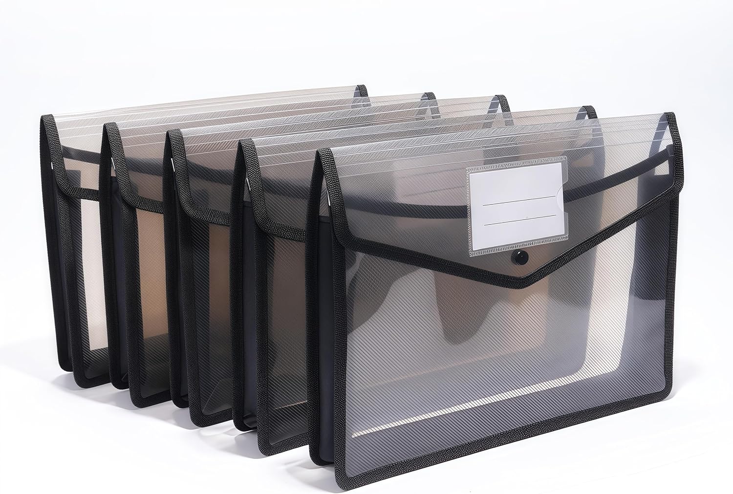 Go&Fan 5 Packs Expanding File Folder,no dividers, Plastic envelopes with snap Closure,Paper Organizer Folder with Lable Pocket (Black)