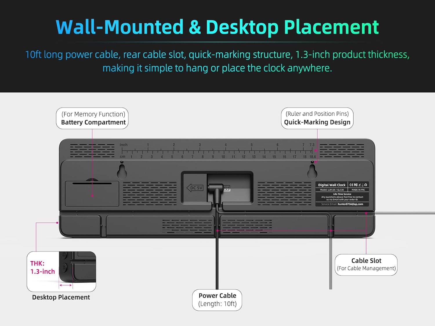 - [SUPPORTS WALL-MOUNTED AND DESKTOP PLACEMENT] -- The 10ft long power cable, rear cable slot, quick-marking structure, and 1.3-inch product thickness, making it simple to hang or place the clock anywhere.