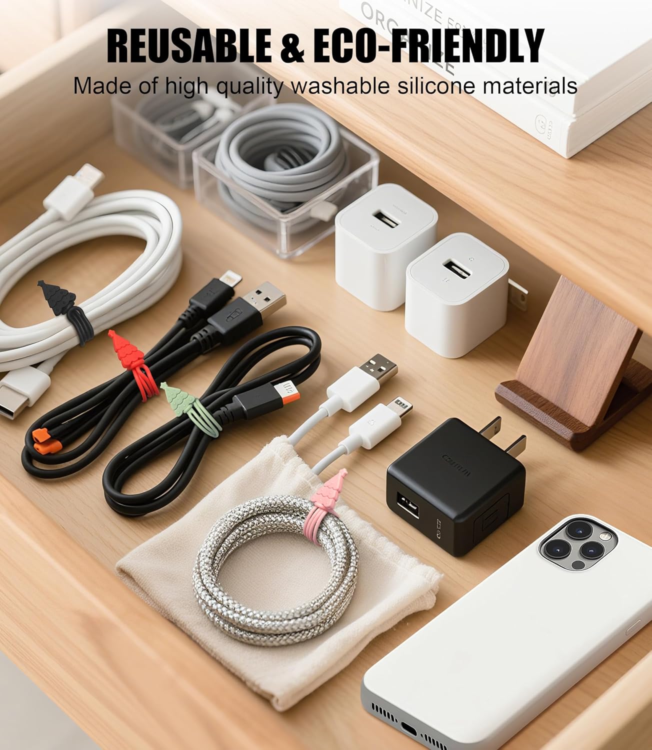- 【Easy to Use & Anti-Loss】The most convenient design allows you to easily organize like tying a rubber band. Compact and portable, but it still has anti loss function. Simply wrap around the cable and thread the tail end through the middle to easily secure it to the cable, avoiding loss