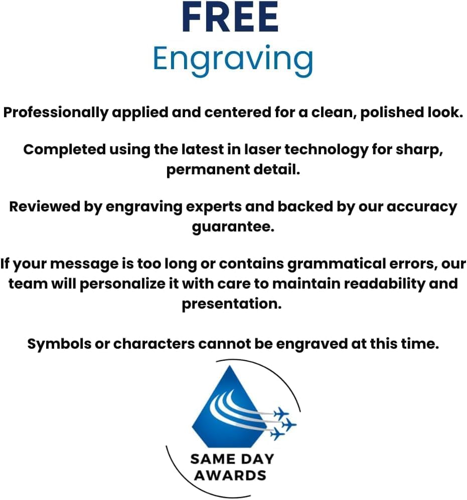 - Free Custom Engraving Included – Personalize with up to 5 lines of custom text (40 characters per line). Black engraving plate (4” x 2”) arrives professionally mounted on the clock.