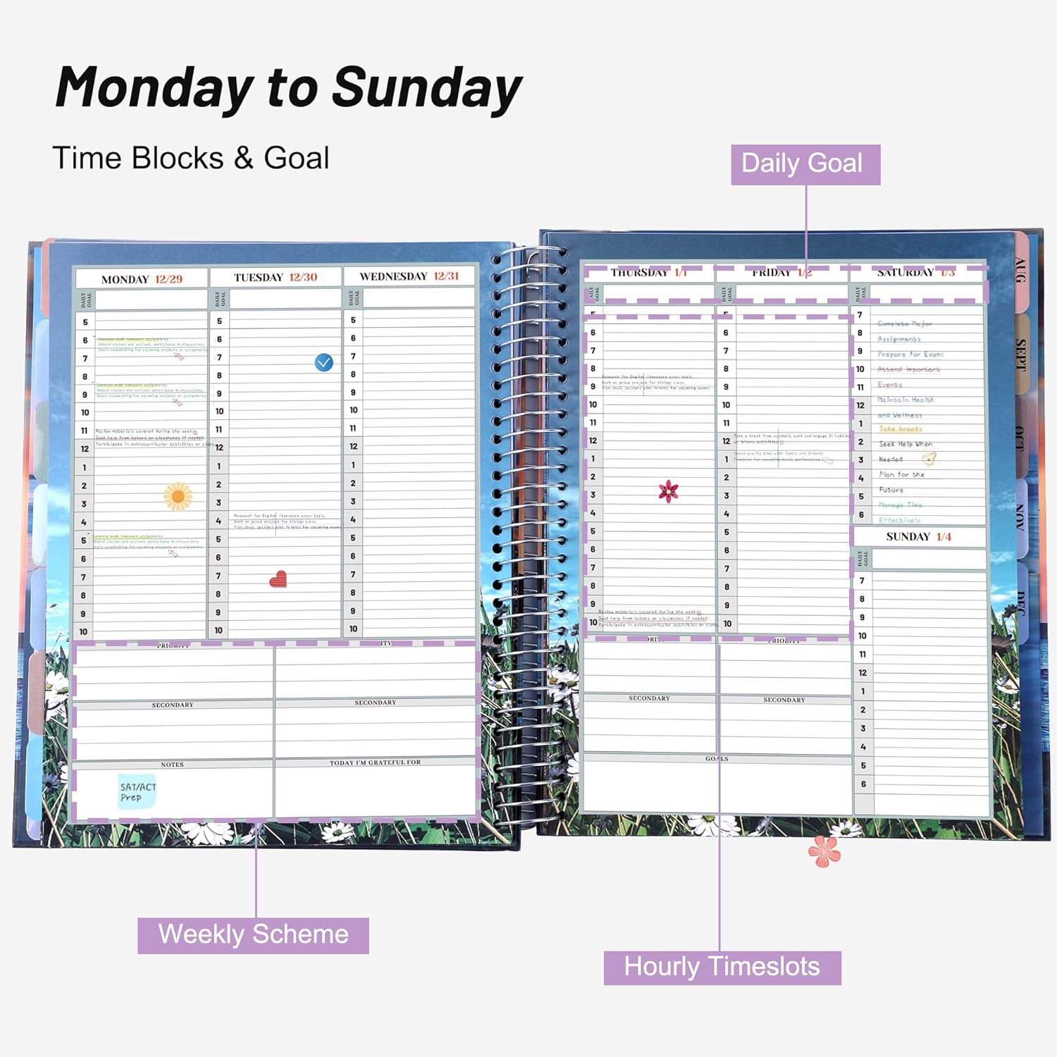 - ENHANCED ORGANIZATION TOOLS: ①Smartly designed extra pages support seamless planning, from yearly strategies down to hourly tasks.②Ultra-smooth thick 120gsm paper resists ink bleed. ③Each month features a unique, full-color scenic backdrop to inspire creativity and refresh your focus. ④Sturdy hardcover with reinforced spiral Binding for daily heavy use. ⑤Quick-access tear-resistant monthly tabs for instant page flipping.