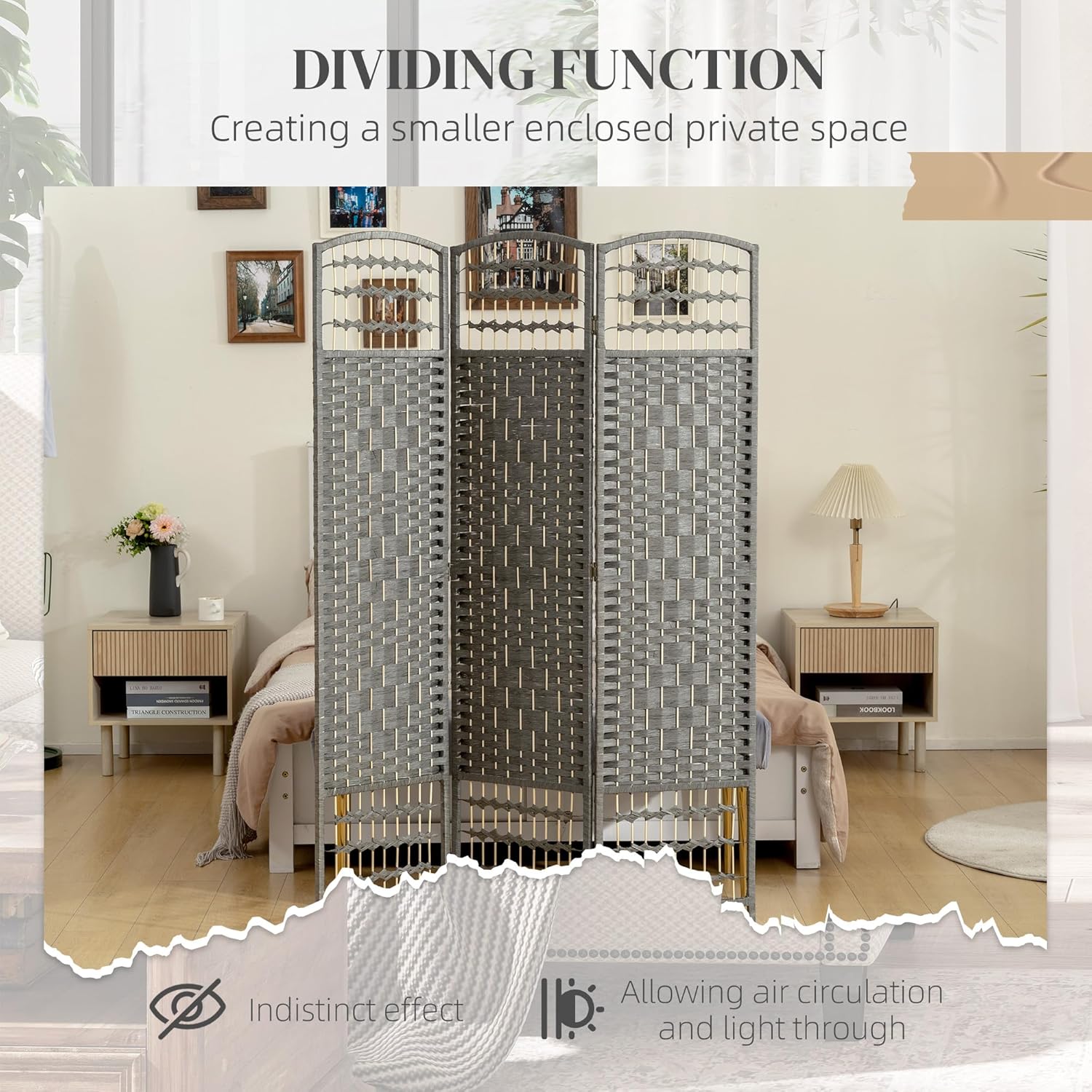 - Quality Material: Constructed of double side woven paper, a solid wood frame, and connecting metal hinges, this room separator is sturdy and smooth while allowing air circulation and light through.